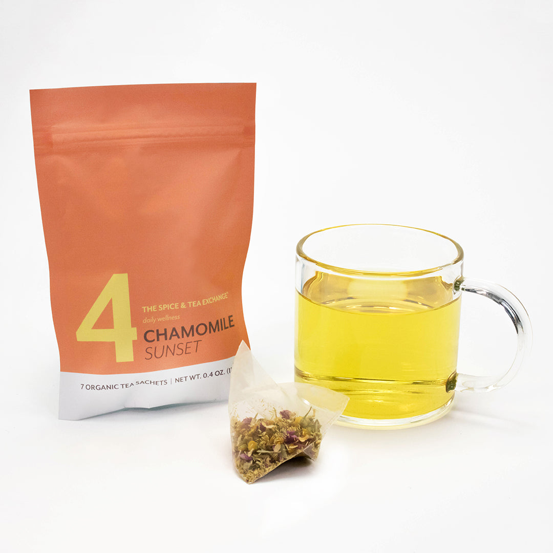 - Chamomile Sunset: chamomile blossom, rose petal, fennel seed, lemon verbena, lemongrass, orange peel.